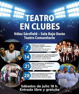 El Sábado 7 de julio comenzó en el club Vélez Sarsfield, Av. Juan B. Justo 9200, el ciclo “Teatro Comunitario en Clubes de Fútbol”, con entrada gratuita y organizado por el Ministerio de Cultura porteño a través de la Dirección General de Promoción Cultural. Participan grupos teatrales de los barrios de Floresta, Parque Patricios, Mataderos y Pompeya.