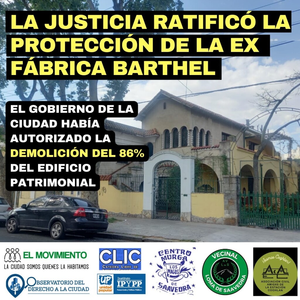 “En el último mes. el GCBA, tanto el Poder Ejecutivo y la Legislatura de la Ciudad de Buenos Aires nos han demostrado que el patrimonio cultural de la ciudad está en grave riesgo aún cuando se encuentre protegido por la ley y que en cualquier momento se pueden buscar artilugios jurídicos para eliminar la protección con la que contaban. La Legislatura, por ejemplo, decidió eliminar la protección patrimonial del inmueble sito en Av. Belgrano 1772 porque la Fundación Favaloro quiere expandir su Hospital Universitario y necesita demolerlo. Ahora el Poder Ejecutivo, ya sin pasar siquiera por la Legislatura, decidió autorizar la demolición del 86% de la ex fábrica Barthel, edificio con alta protección patrimonial. Afortunadamente, en este último caso la justicia sostuvo que el PATRIMONIO NO SE TOCA”.