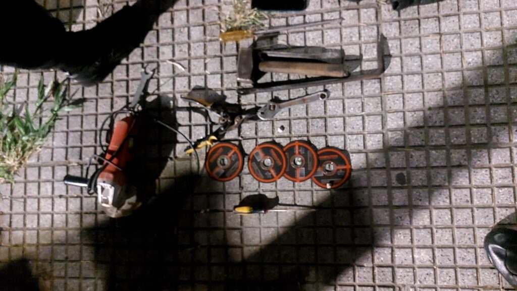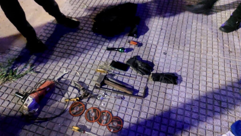 Entre sus pertenencias, los delincuentes de 36 y 52 años, tenían un par de guantes, precintos, una linterna, una barreta metálica, un corta fierro, una masa, una pinza, llave francesa, destornilladores, una moladora con cuatro discos de corte y una tijera, entre otros objetos.
