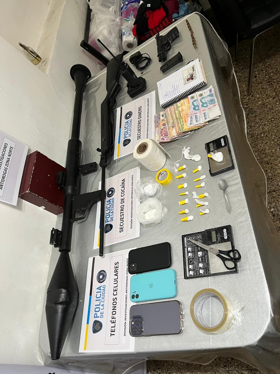 Durante el operativo se secuestraron:15 envoltorios y una bolsa con trozos de cocaína totalizando un peso de 40.9 gramos Un arma de fuego Bersa 9 mm, con ocho municiones, cuatro de ellas de punta hueca; Un equipo de comunicación tipo HT marca Baofeng con base y cargador, utilizado como inhibidor de señal; $ 154.600 en efectivo; Tres teléfonos celulares, balanzas de precisión, anotaciones y elementos de interés para la causa; Un rifle de aire comprimido y una réplica de lanzacohetes RPG-7 de origen soviético, presumiblemente usada con fines intimidatorios; Prendas similares a uniformes policiales, incluyendo un par de borceguíes y dos pantalones tipo cargo.